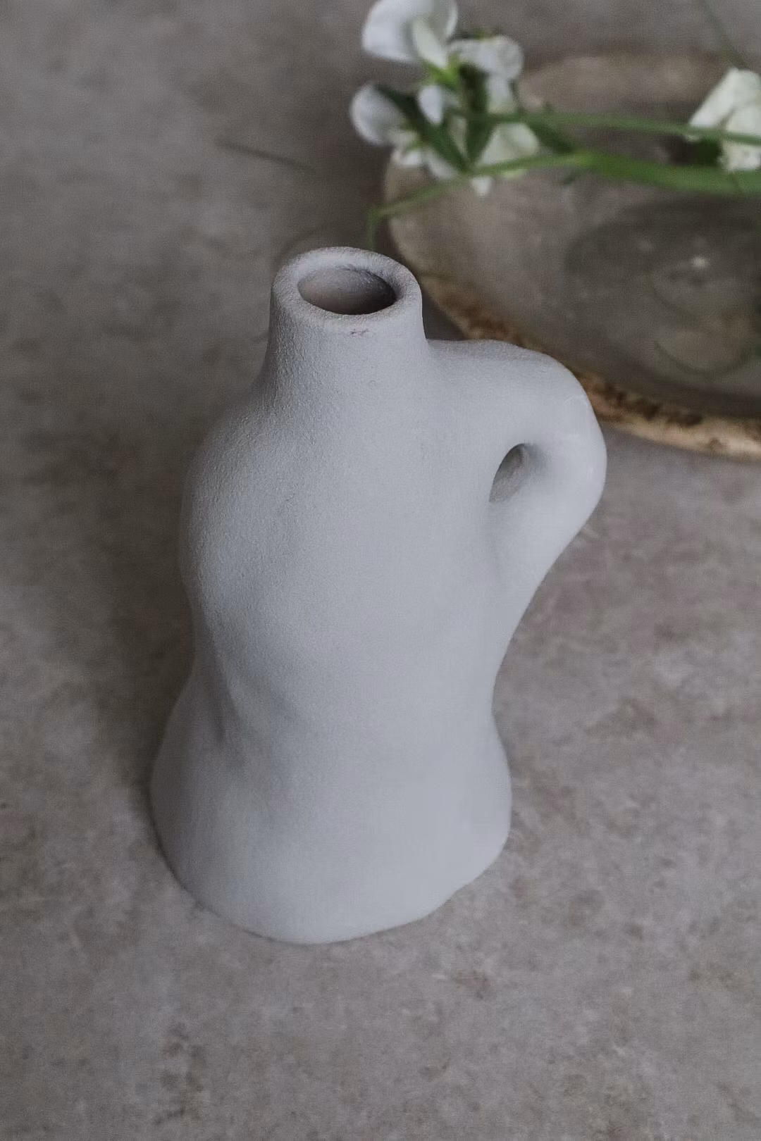 Den är tillverkad i stengods och har en matt yta som går i en gråbeige ton.