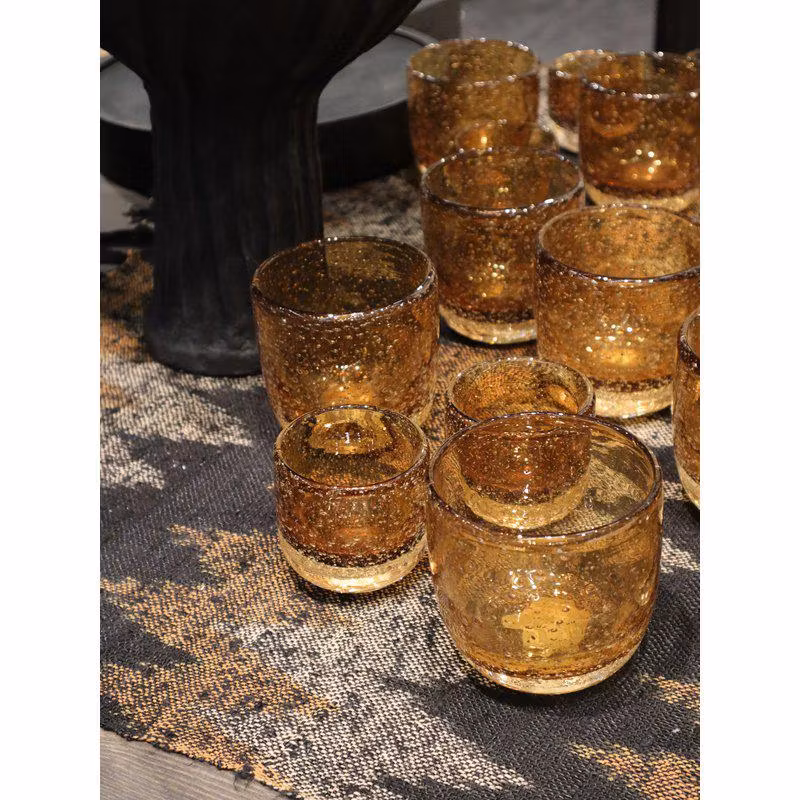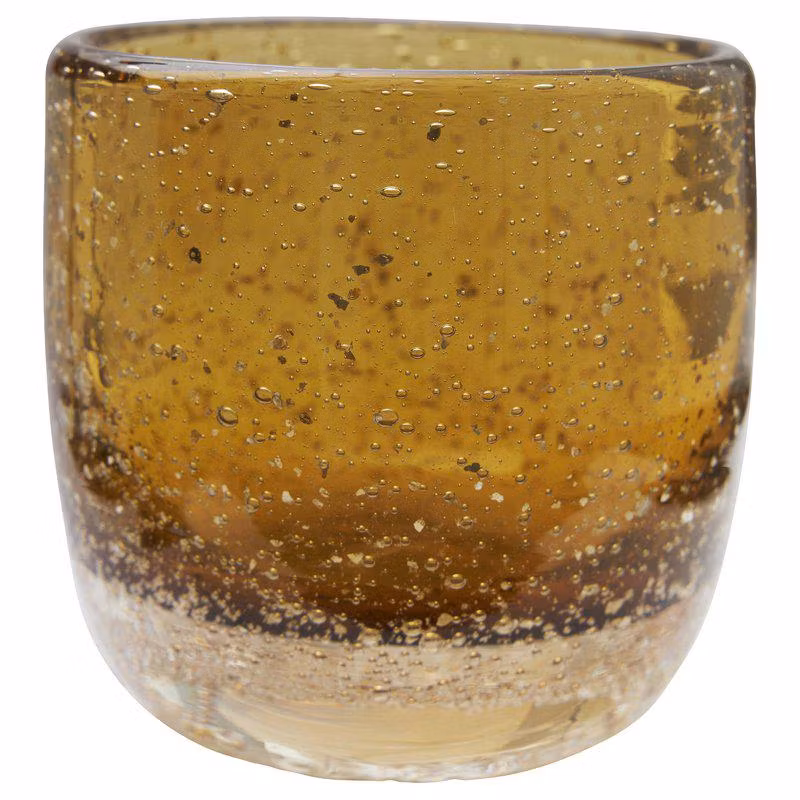 Den orange glaslyktan har en rund nederdel och små luftbubblor i glaset som ger varje lykta sitt unika uttryck.