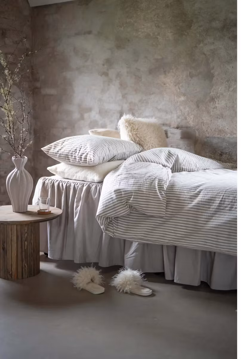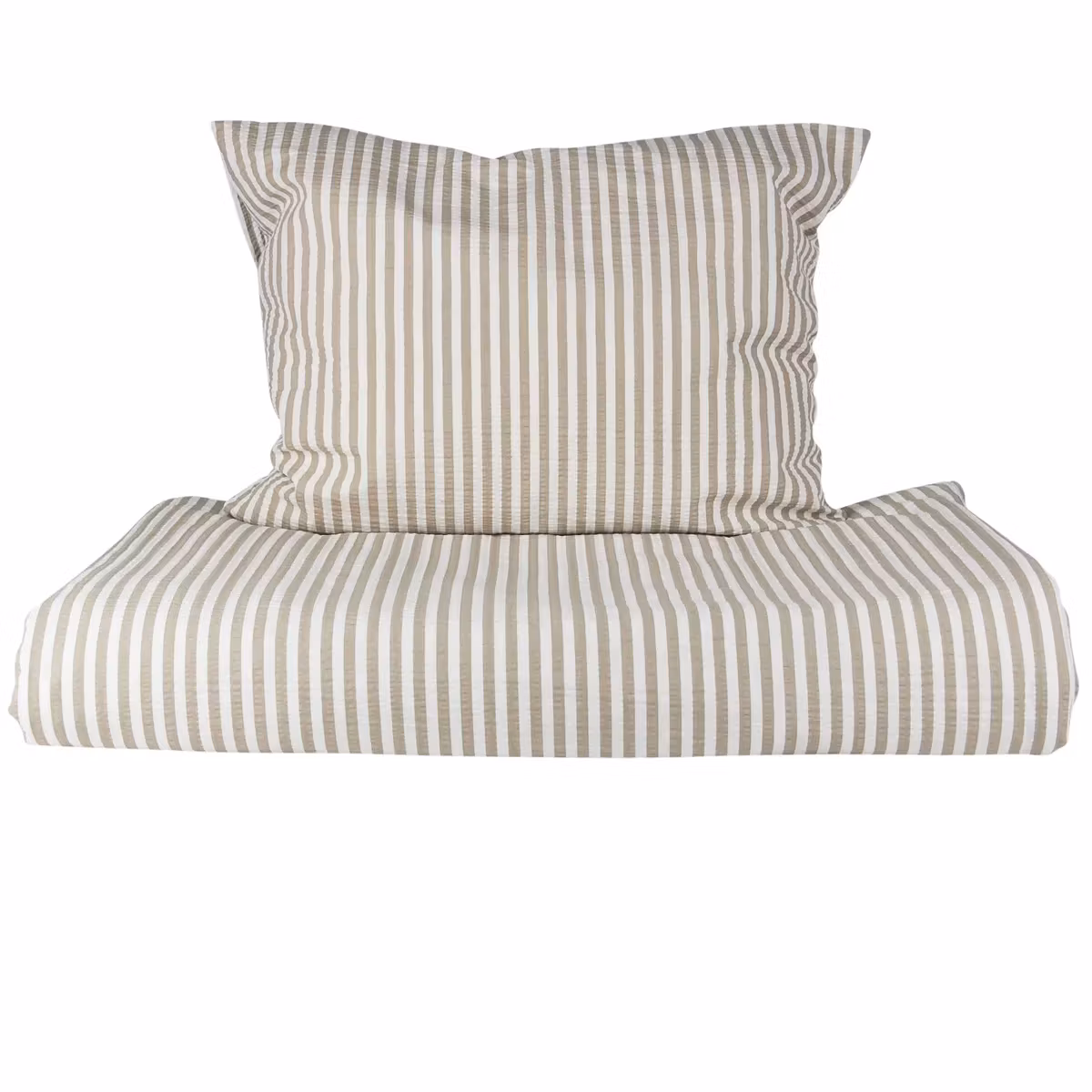 Detta bäddset har ett randigt mönster som går i lin och vitt.